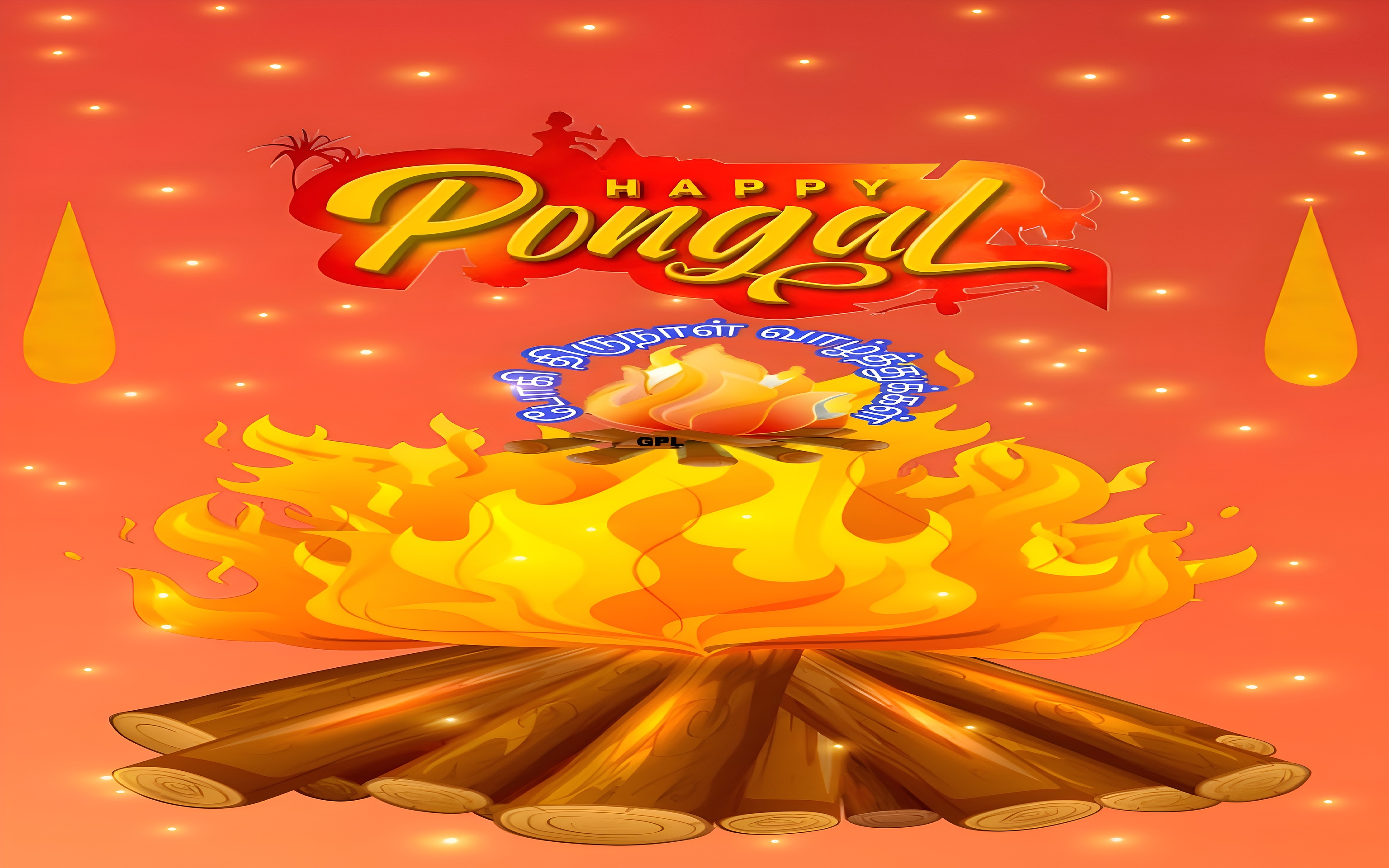 Pongal is a major harvest festival celebrated predominantly in Tamil Nadu, India, symbolizing prosperity and gratitude. This wallpaper reflects the cultural richness of the festival through its depiction of the bonfire, which is central to many Pongal rituals. The glowing lights and warm orange palette create an inviting atmosphere that resonates with the themes of harvest and thanksgiving. Such festive wallpapers are popular for mobile wallpaper, desktop backgrounds, and wall art, especially during the Pongal season. The vibrant yellow flames and deep red accents add energy and life, making this design a premium choice for those seeking high-definition backgrounds that celebrate Indian traditions.