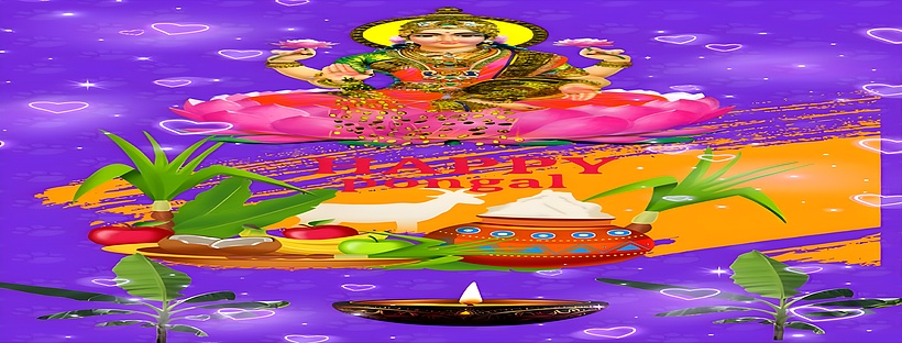 This Happy Pongal Festival HD Wallpaper beautifully captures the essence of the traditional South Indian harvest festival with a vibrant and spiritual artistic style. The main subject is the divine depiction of Goddess Lakshmi seated gracefully on a large, vivid pink lotus flower, symbolizing wealth and prosperity. The goddess is adorned in intricate traditional attire with golden jewelry, set against a glowing yellow halo that contrasts strikingly with the rich purple background. This wallpaper blends cultural symbolism with modern digital artistry, creating a festive atmosphere that radiates warmth and devotion.