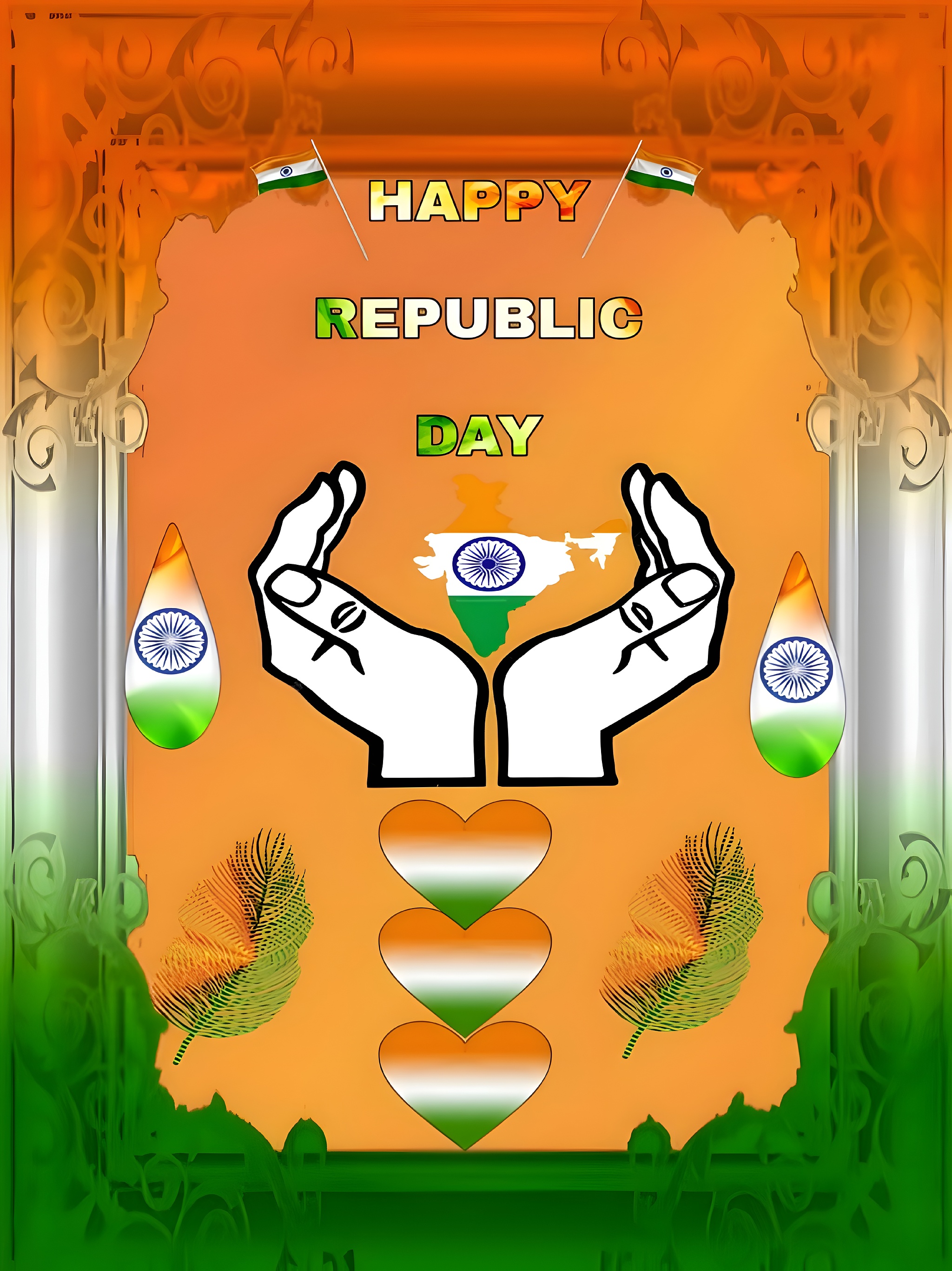 Celebrate the spirit of India with this vibrant Happy Republic Day India Wallpaper, a stunning tribute to the nation's unity and heritage. This high-resolution wallpaper beautifully captures the essence of India's Republic Day with a rich palette of saffron orange, white, and India green, complemented by navy blue accents. The central focus is a pair of stylized hands gently cradling the map of India, which is adorned with the iconic Ashoka Chakra, symbolizing peace and progress. Surrounding this are heart shapes and feathers in the Indian tricolor, enhancing the festive and patriotic mood. The background features intricate ornamental patterns blending seamlessly into the saffron and green gradient, creating a warm and inviting atmosphere perfect for desktop backgrounds or mobile wallpapers.