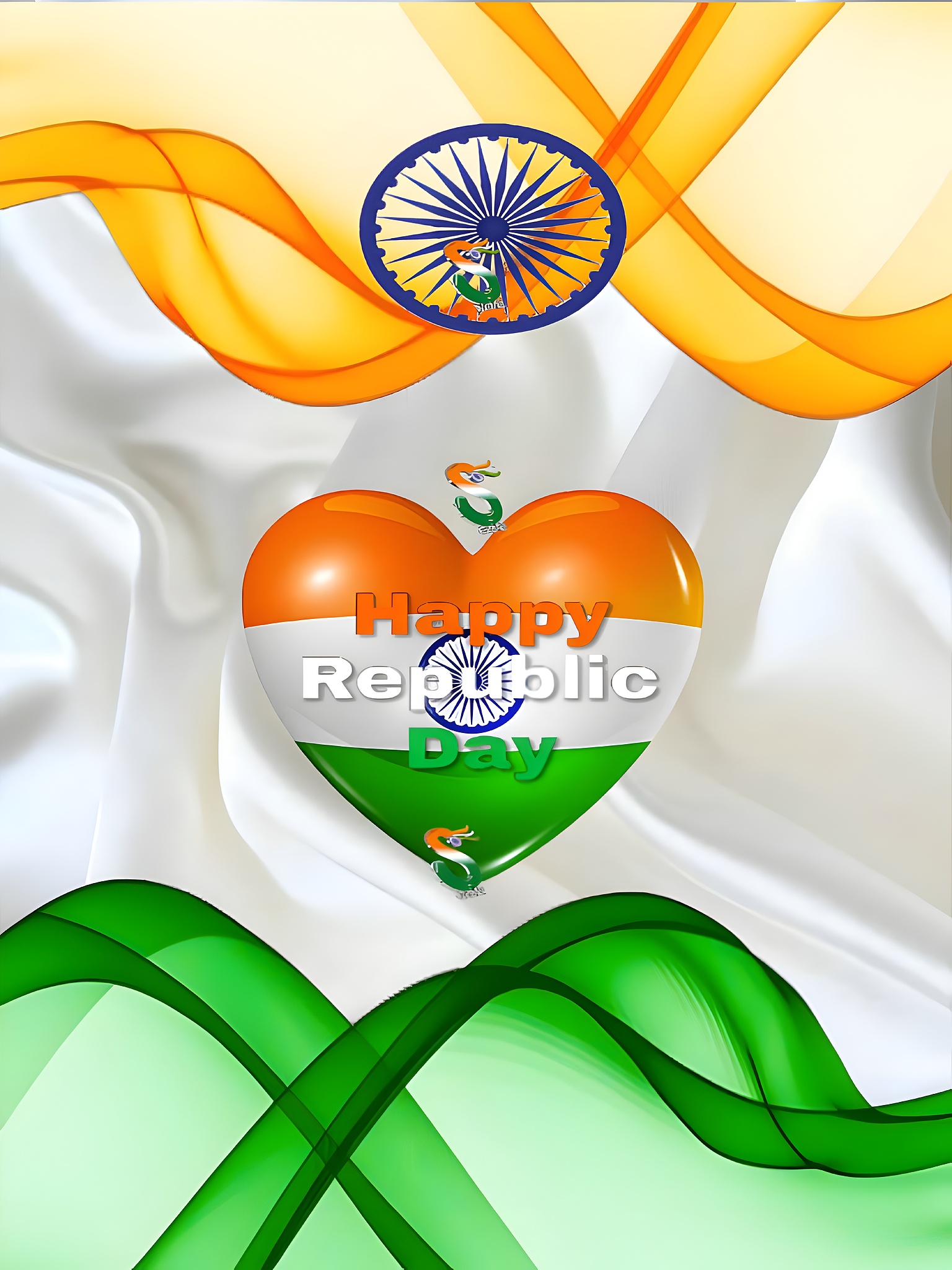 This Happy Republic Day Indian Flag Wallpaper beautifully captures the spirit of India’s national pride with a modern and artistic interpretation of the tricolor flag. The main subject is a heart-shaped emblem painted in the iconic saffron orange, white, and India green stripes, symbolizing unity and patriotism. At the center of the heart is the navy blue Ashoka Chakra, a 24-spoke wheel representing the eternal wheel of law. Above the heart, a larger Ashoka Chakra floats with a stylized 'S' in the colors of the Indian flag, adding a festive and celebratory touch. The background features flowing, translucent waves of orange and green that mimic the flag’s colors, set against a smooth white fabric texture that evokes the flag’s cloth.