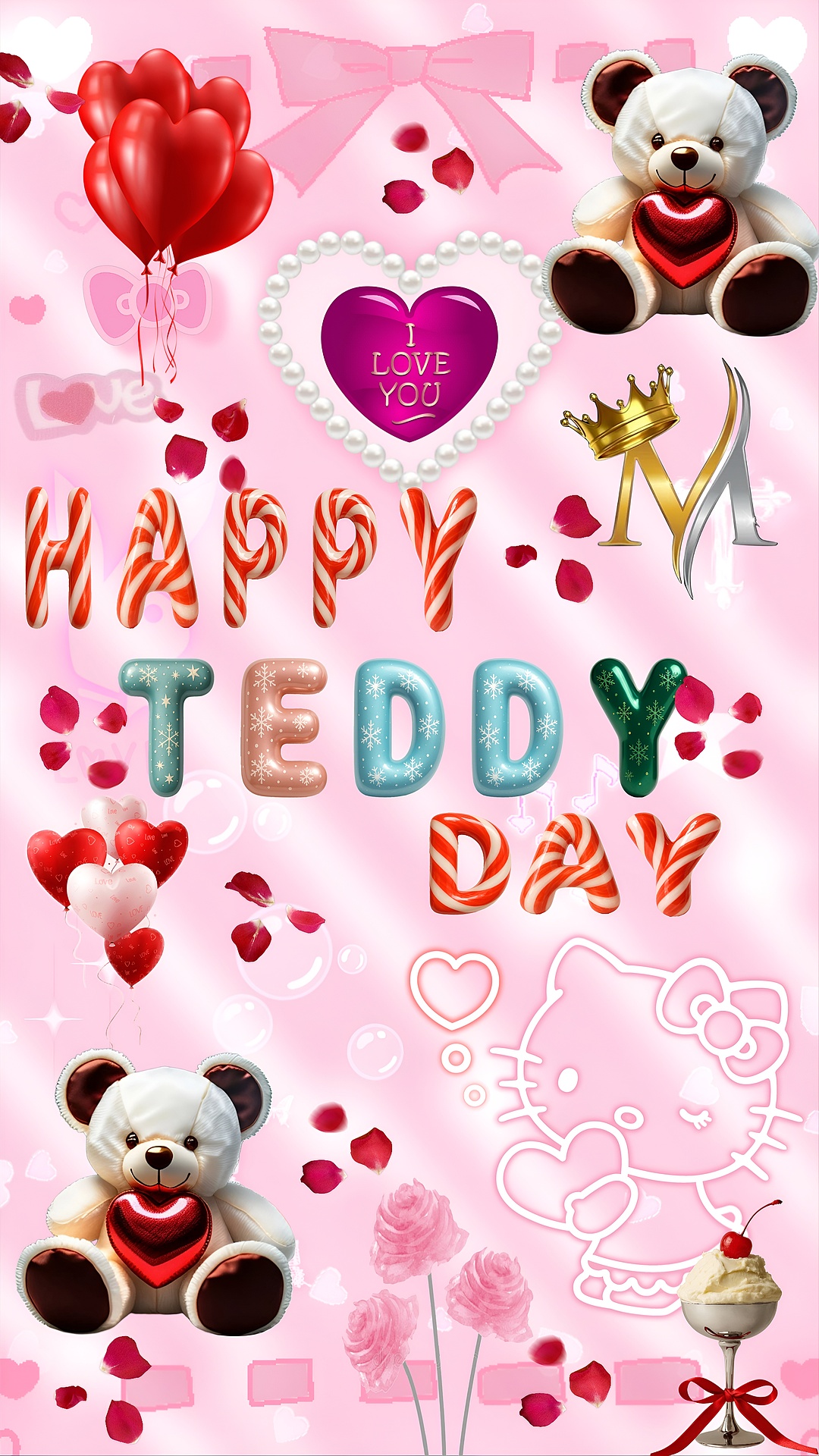 The Happy Teddy Day Romantic Wallpaper uses a harmonious palette of soft pink, bright red, pearl white, and pastel blue that evokes feelings of warmth, joy, and tenderness. The lighting is soft and diffused, giving the image a dreamy glow, while the textures range from smooth and shiny surfaces on the balloons and hearts to fluffy and cuddly teddy bears. The candy cane letters add a playful, festive vibe, and the scattered rose petals introduce a natural, romantic element. The inclusion of the Hello Kitty outline adds a whimsical, nostalgic charm that appeals to a wide audience. This wallpaper is perfect for those looking for high-resolution wallpaper with a romantic theme, ideal as a desktop background or mobile wallpaper.
