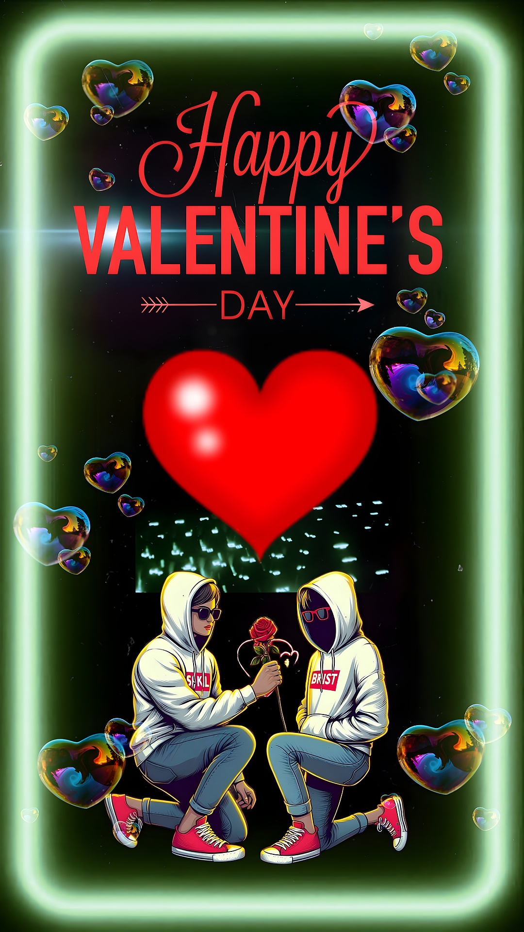 Celebrate the spirit of love with this captivating Happy Valentine's Day Romantic Art wallpaper, designed to evoke warmth and affection. The image features two stylized figures wearing white hoodies and red sneakers, kneeling opposite each other in a tender moment. One figure offers a single red rose, symbolizing romance and heartfelt emotions. The scene is framed by a glowing neon green border that adds a modern and vibrant touch to the composition. Floating translucent heart-shaped bubbles with iridescent colors surround the couple, enhancing the dreamy and affectionate atmosphere.