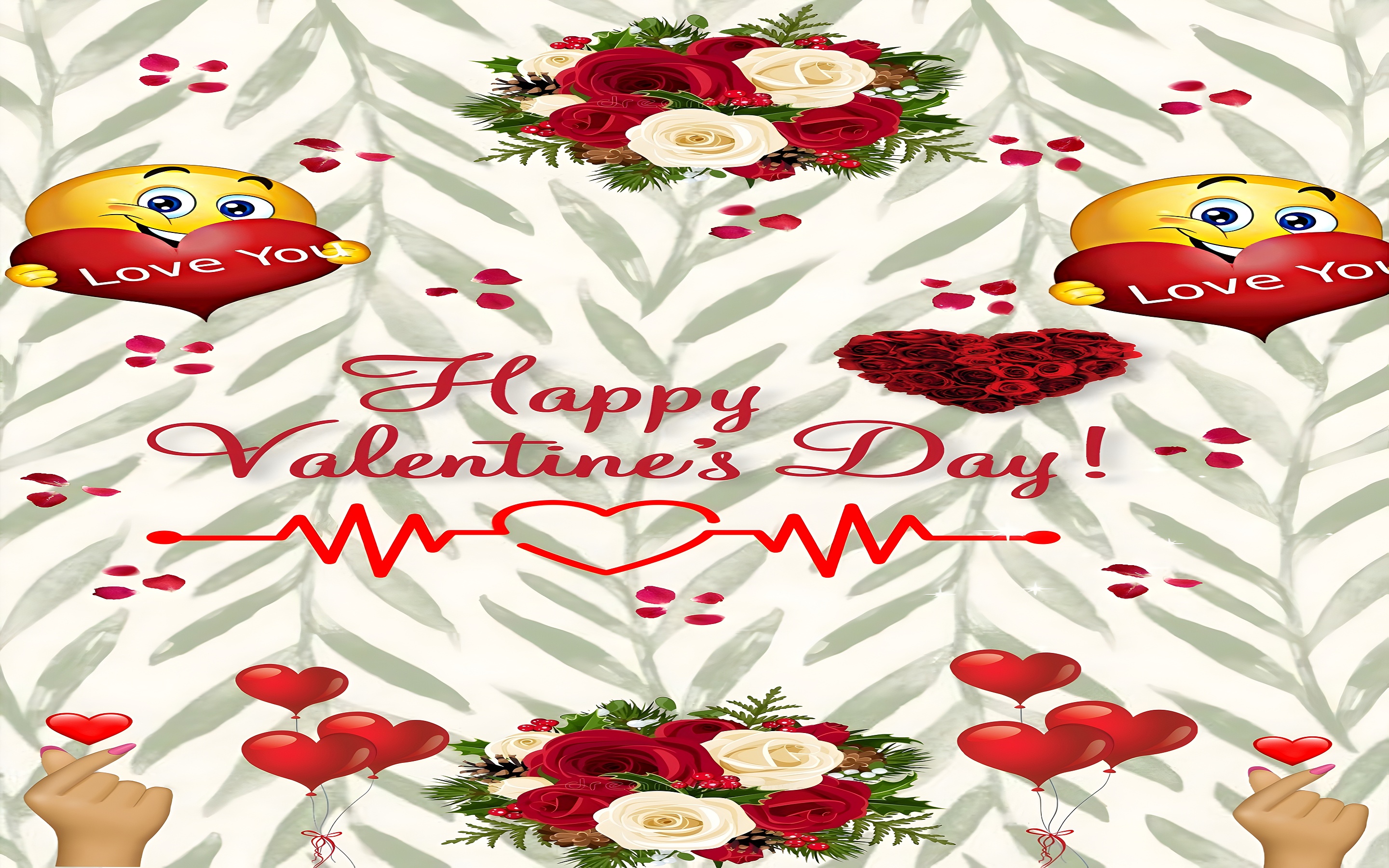 This romantic wallpaper uses a blend of artistic elements such as vibrant red rose bouquets, heart-shaped balloons, and playful emojis to create a lively yet tender mood. The red roses symbolize deep love and passion, while the cream-colored roses add elegance and purity to the composition. Scattered rose petals and heart motifs enhance the romantic theme, making it perfect for Valentine’s Day celebrations. The heartbeat line with a heart in the center adds a modern and symbolic touch, representing love’s pulse and emotional connection. This wallpaper’s soft green leafy background balances the vivid reds and yellows, creating a harmonious and visually appealing desktop or mobile wallpaper.