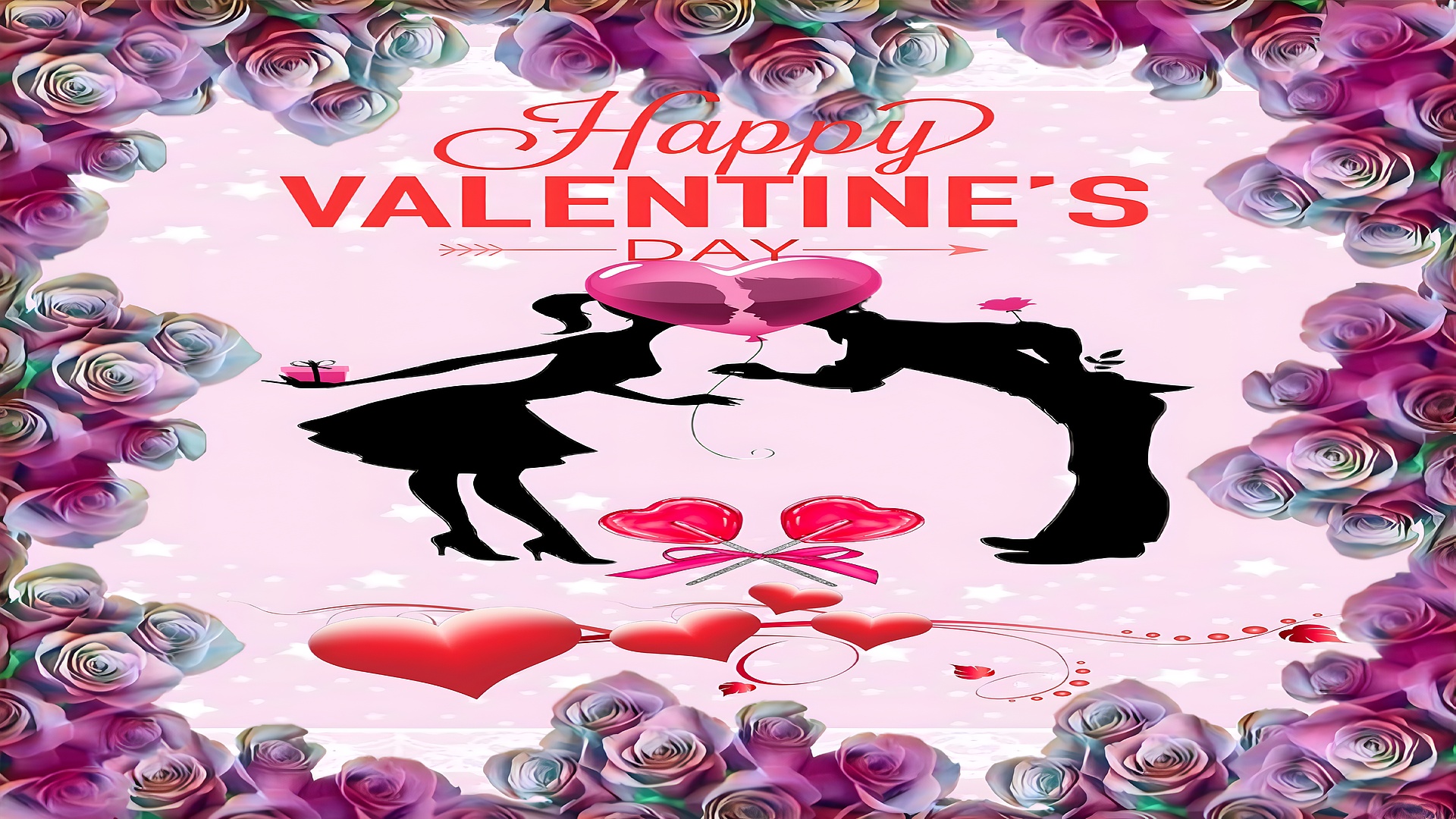 This Happy Valentine's Day Romantic Silhouette wallpaper beautifully captures the essence of love and celebration with a charming and artistic design. The main subjects are two black silhouetted figures—a woman and a man—engaged in a sweet romantic gesture. The woman holds a small gift box while the man offers a heart-shaped balloon, symbolizing affection and thoughtful giving. The balloon itself is uniquely detailed with the profiles of the couple facing each other, adding a creative and emotional touch to the composition. Surrounding the couple is a lush border of pastel pink and lavender roses, enhancing the romantic and festive atmosphere.