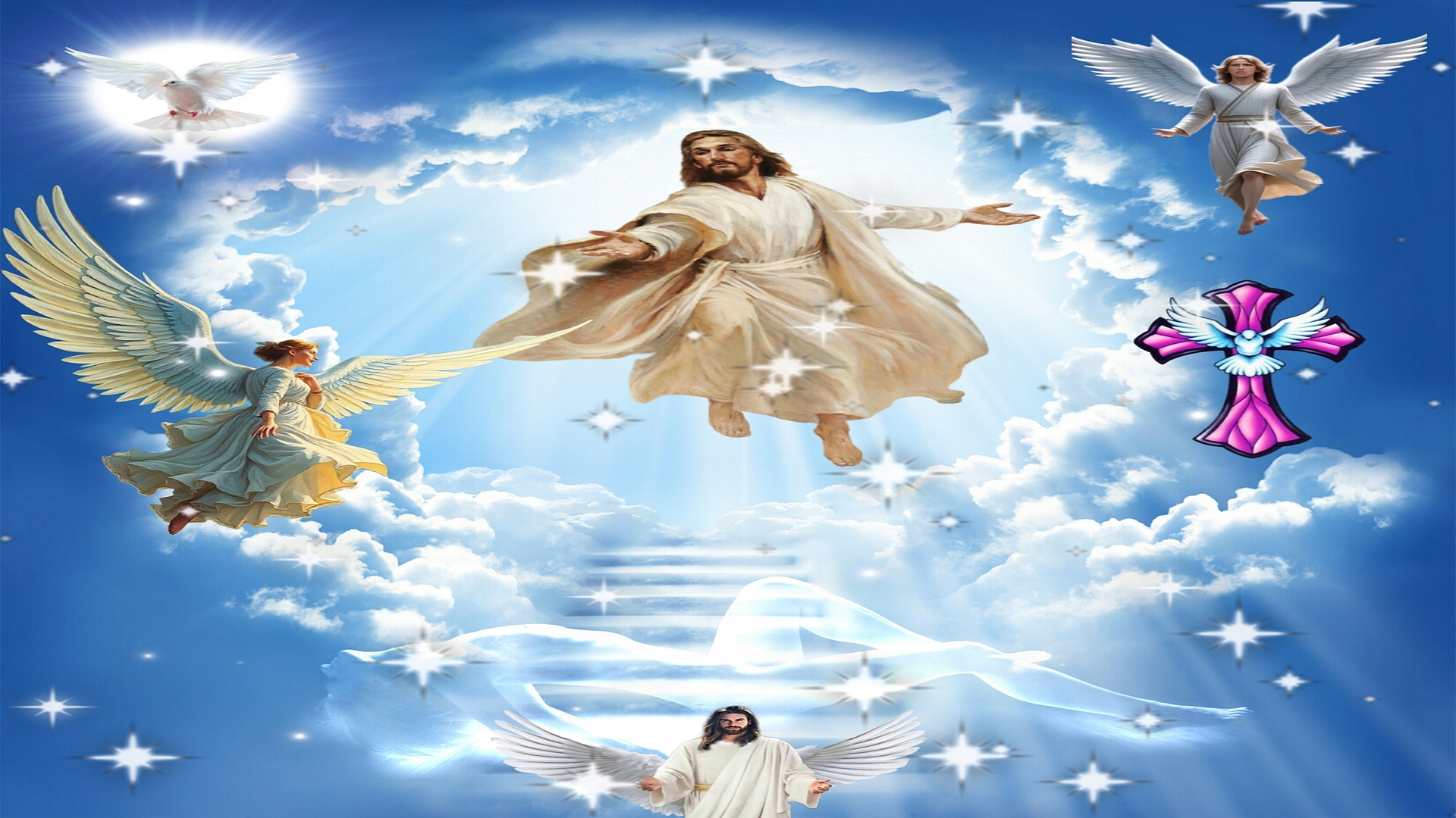 Heavenly Ascension Angels HD wallpaper captures a breathtaking religious-themed scene centered around the ascension of Jesus Christ. Radiant light and soft clouds envelop the figure in white robes, symbolizing purity and divine presence. Surrounding Him are angels with graceful wings, floating in a luminous sky filled with glowing stars. A white dove, representing the Holy Spirit, glides near the top left, while a radiant cross adds spiritual depth to the right.