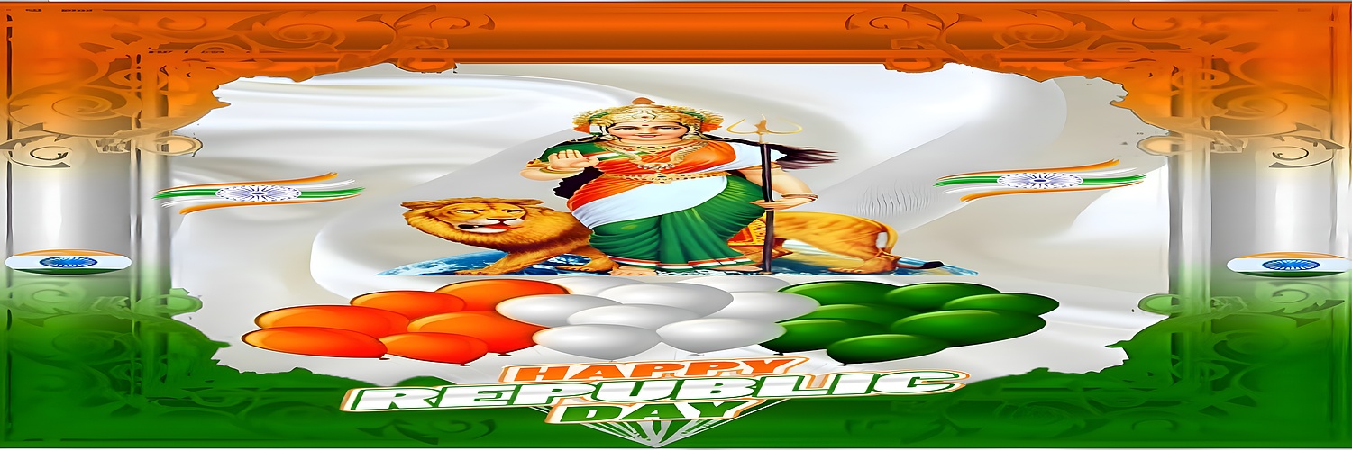 The artistic style combines traditional Indian iconography with modern digital design, framed by intricate orange and green ornamental patterns that echo the hues of the Indian flag. The background features a smooth white fabric-like texture, enhancing the central figure’s prominence and creating a peaceful, uplifting atmosphere. The inclusion of tricolor balloons in saffron orange, white, and deep green adds a festive touch, celebrating the joyous occasion of Republic Day. This wallpaper’s warm golden yellow accents in the goddess’s crown and jewelry enrich the overall palette, making it a vibrant and meaningful piece of wall art.