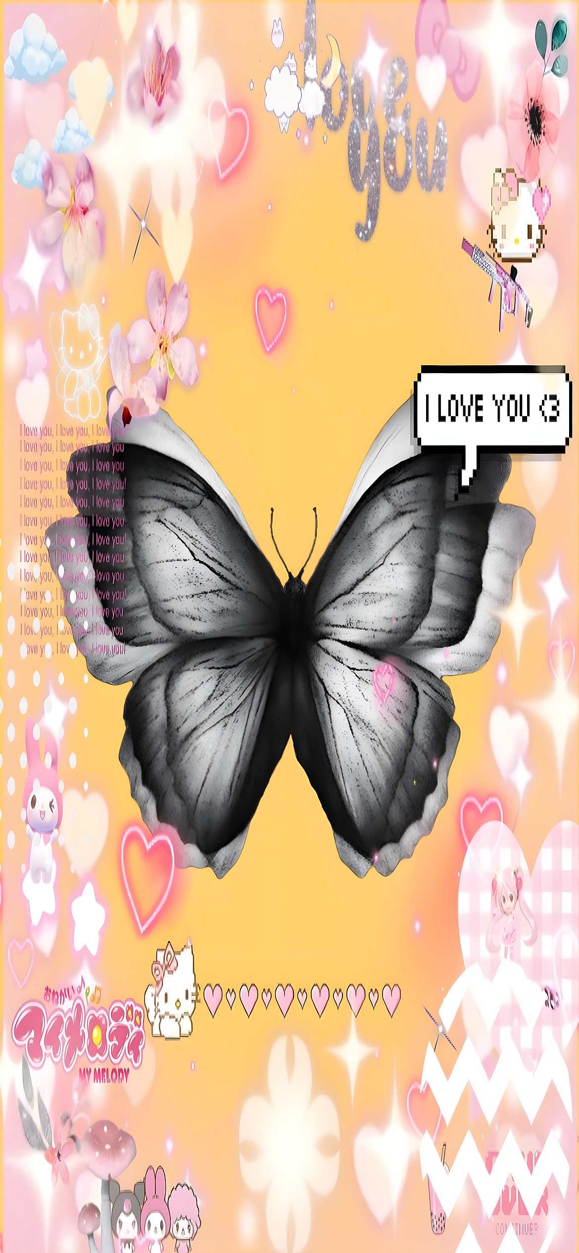 Kawaii Butterfly dreamy HD wallpaper features a striking black-and-white butterfly adorned with a delicate pink heart, set against a warm gradient of orange and pink hues. Surrounding the butterfly are playful kawaii elements—cherry blossoms, glittery hearts, pastel stars, and beloved characters like Hello Kitty and My Melody.