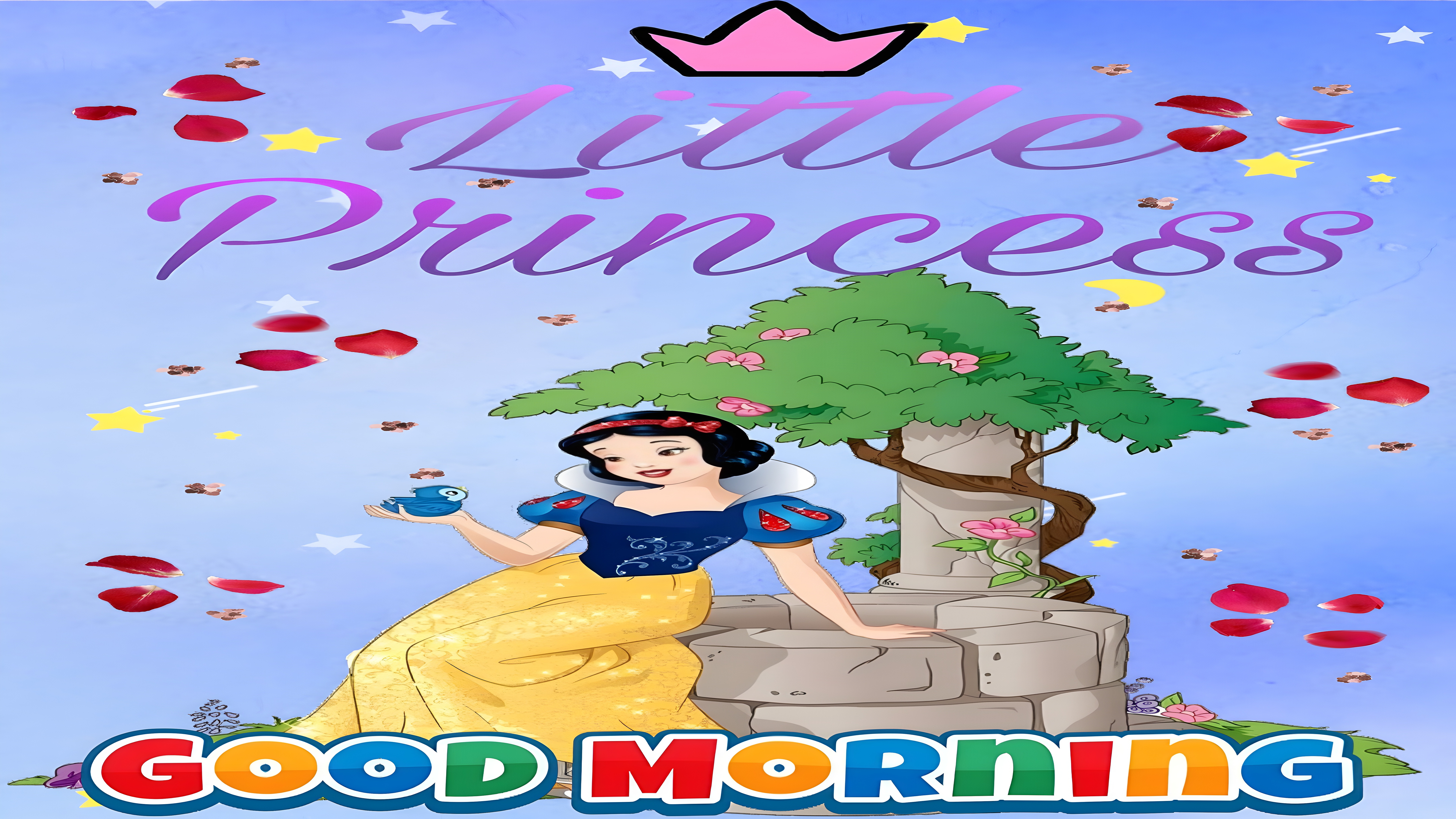 This Little Princess Good Morning Wallpaper beautifully captures the essence of a classic fairy tale morning scene, featuring a beloved princess character sitting gracefully by a stone well. The princess, adorned in a vibrant yellow gown with sparkling details and a royal blue bodice, holds a small blue bird gently in her hand, symbolizing peace and friendship. The background is a soft, bright blue sky sprinkled with whimsical stars, rose petals, and floral accents, creating a magical and inviting atmosphere. Above her, the words "Little Princess" appear in elegant purple script beneath a pink crown illustration, while the phrase "GOOD MORNING" bursts with colorful, playful letters at the bottom, making this wallpaper perfect for a cheerful start to any device screen.