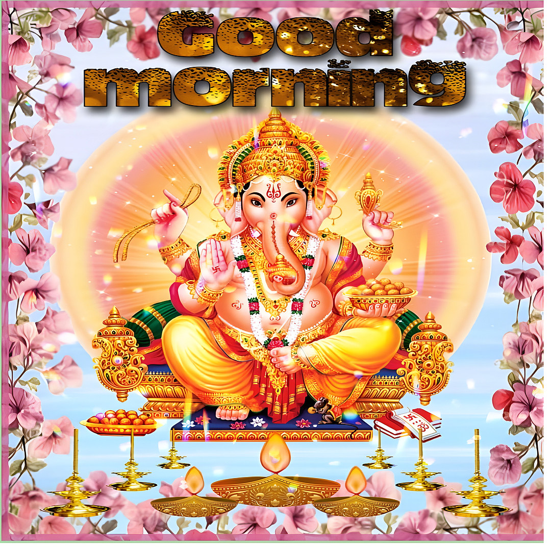 This Lord Ganesha Good Morning Wallpaper beautifully captures the divine essence of the beloved Hindu deity Ganesha, seated regally on an ornate golden throne. The image is rich with vibrant colors and intricate details, featuring Ganesha adorned in bright orange and golden yellow robes, symbolizing wisdom and prosperity. The deity is surrounded by a radiant halo that glows with warm golden hues, enhancing the spiritual atmosphere. The background is a serene sky blue, framed by delicate pink flowers that add a soft, natural touch to the composition. The greeting “Good morning” appears prominently at the top in bold, textured golden letters, setting a positive and uplifting tone for the day.