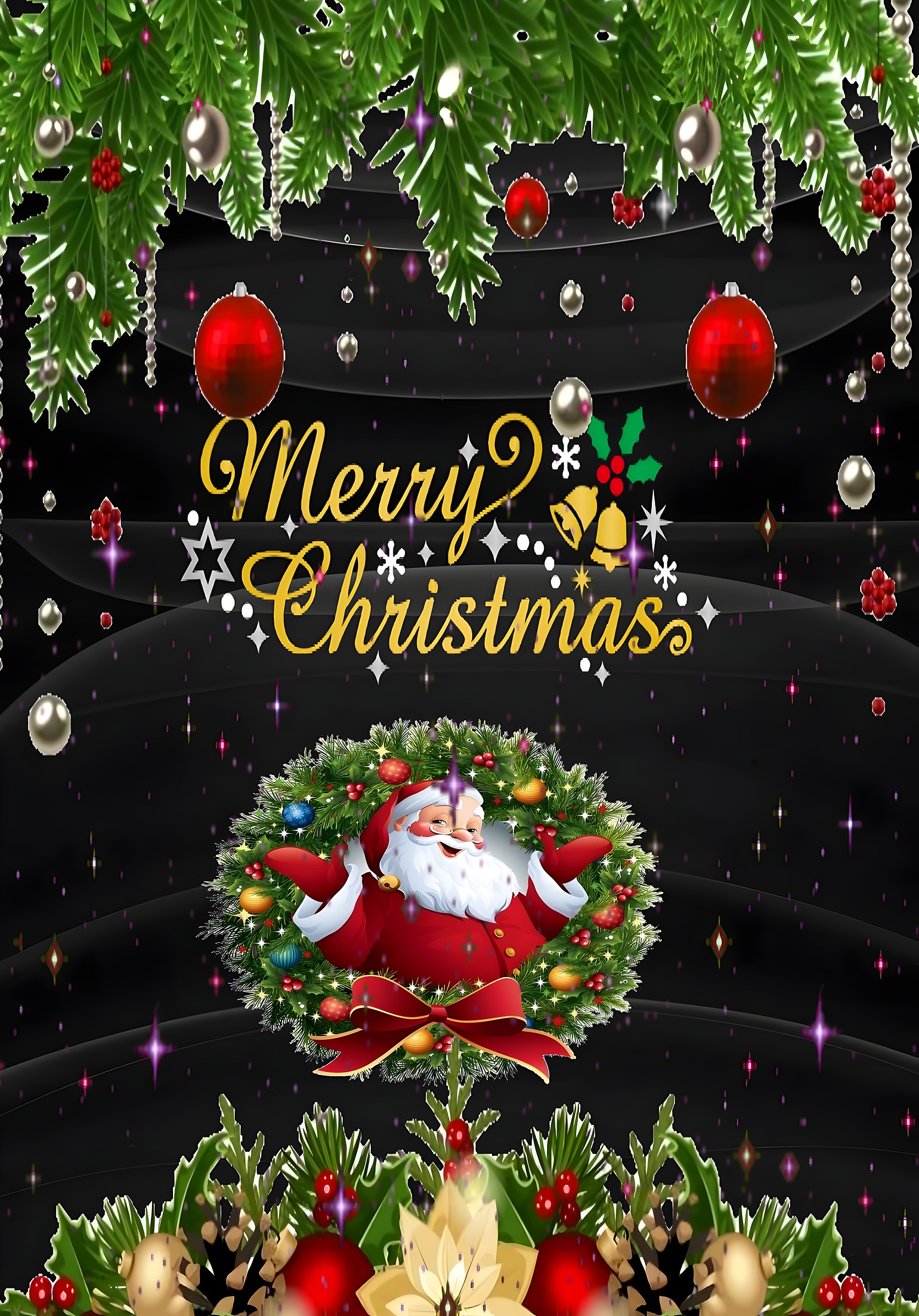 Celebrate the joyous spirit of the holiday season with our Merry Christmas Festive HD Wallpaper. This vibrant design features a cheerful Santa Claus surrounded by a lush green wreath adorned with colorful ornaments. The deep red accents of Santa's suit contrast beautifully against the black background, creating a striking visual that captures the essence of Christmas. With the words 'Merry Christmas' elegantly scripted in golden yellow, this wallpaper brings warmth and joy to any screen, making it perfect for desktops, tablets, and mobile devices alike.