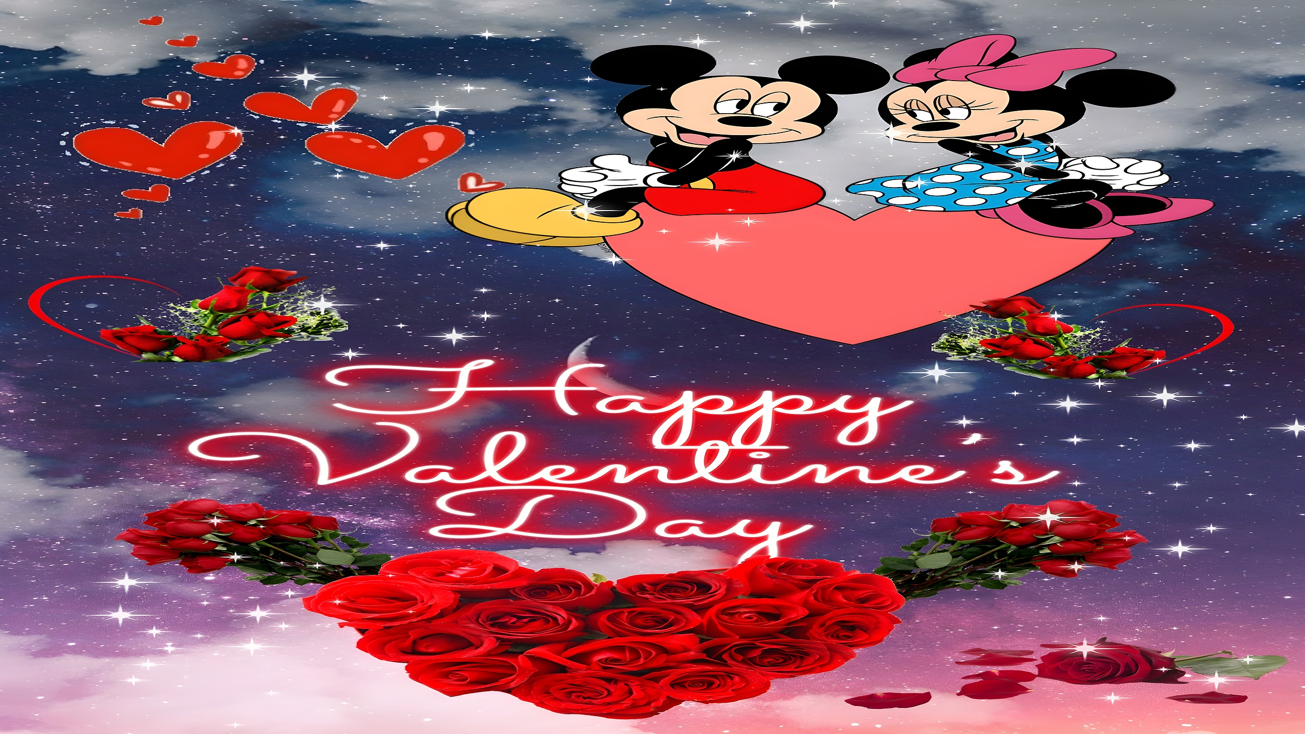 This enchanting Mickey and Minnie Valentine's Day wallpaper beautifully captures the timeless love between two of Disney's most beloved characters. Set against a dreamy night sky filled with twinkling stars and soft clouds, Mickey and Minnie Mouse sit atop a large pink heart, exchanging shy, affectionate glances. The scene is bursting with romantic energy, enhanced by floating red hearts and vibrant bouquets of red roses arranged in heart shapes, symbolizing love and devotion. This high-resolution wallpaper blends classic cartoon charm with a magical cosmic backdrop, making it perfect for anyone looking to celebrate love with a touch of whimsy and nostalgia.
