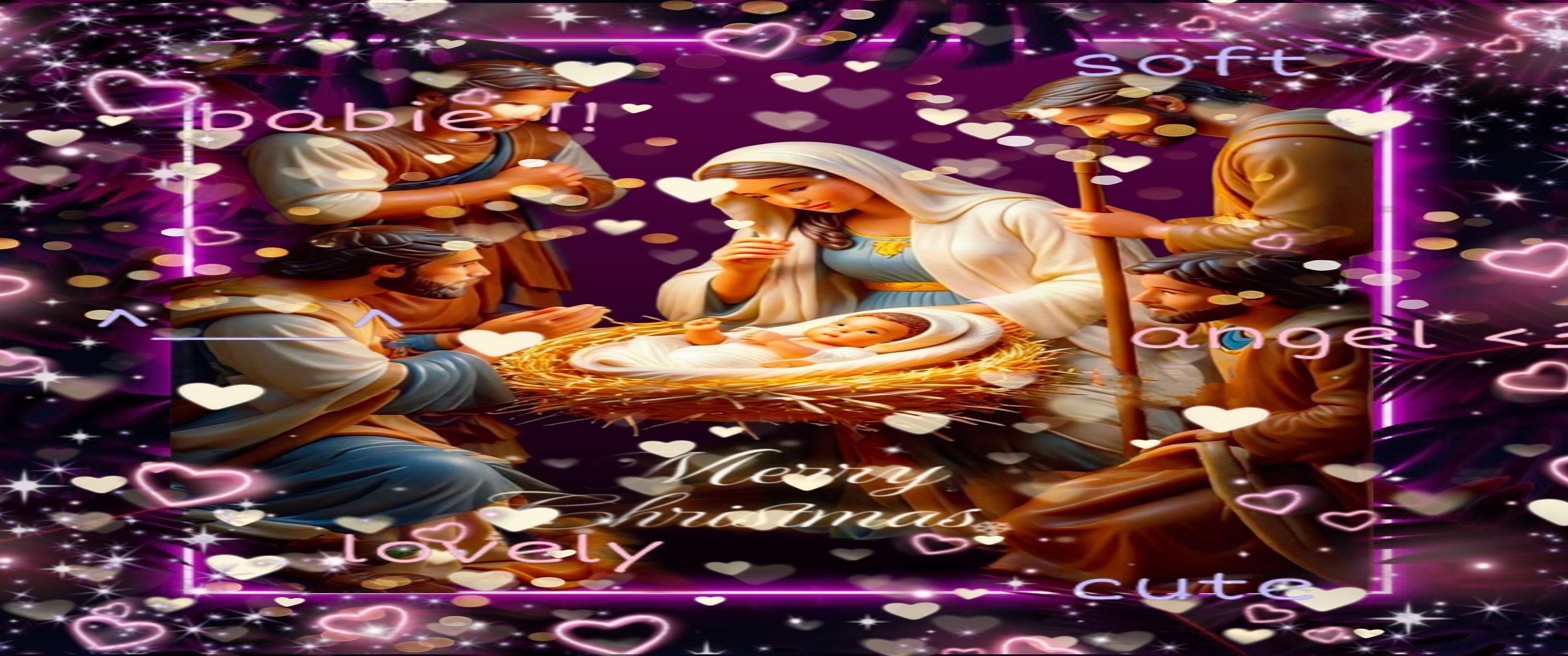 Nativity Christmas HD wallpaper captures the heartwarming essence of the Nativity scene, digitally enhanced with a dreamy purple backdrop and glowing sparkles. At the center lies baby Jesus in a manger, surrounded by Mary, Joseph, and three shepherds, radiating warmth and serenity. Floating heart shapes and festive overlays like “babie!!”, “soft”, “angel”, and “Merry Christmas” add a playful, tender touch to the traditional Christian imagery.