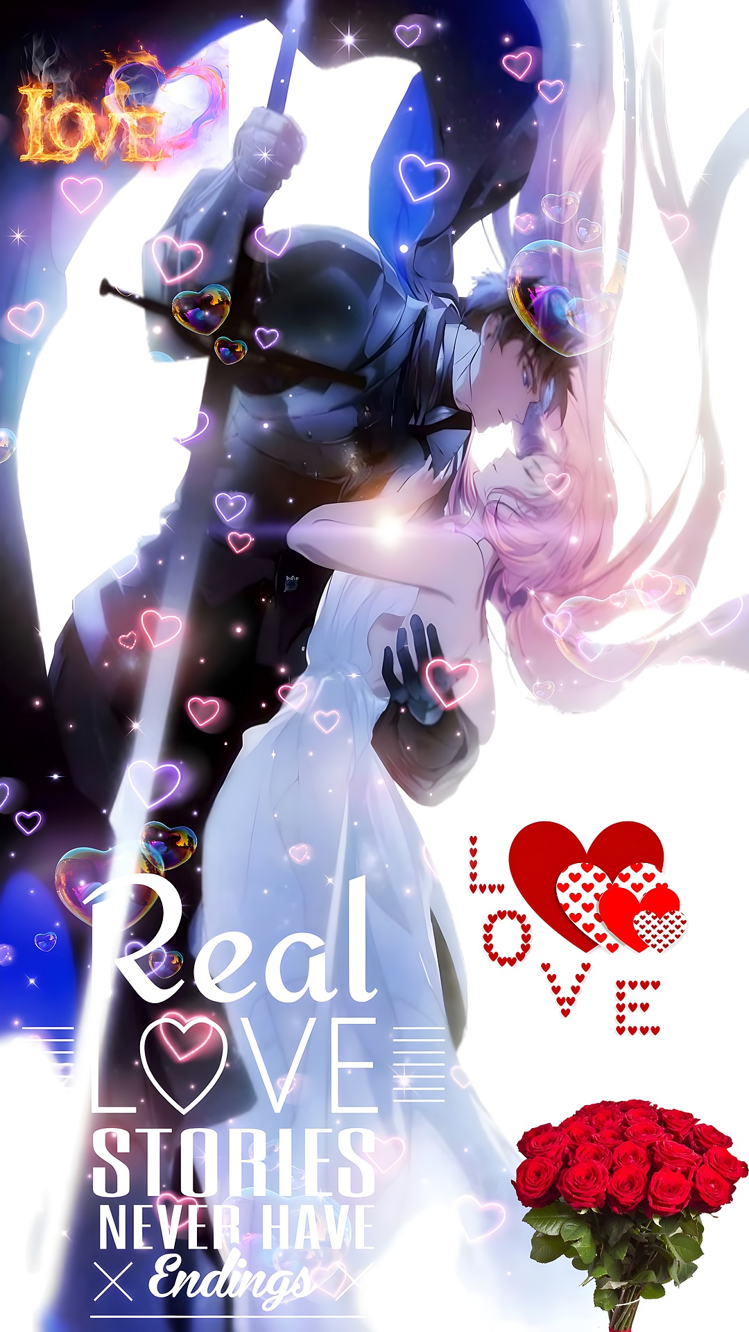 This wallpaper features several key artistic elements that make it stand out as a premium HD romantic background. The interplay of soft pink hues and deep black tones creates a visually appealing contrast, while the bright white highlights add depth and luminosity. The floating heart shapes, some glowing softly in pink and purple, symbolize love and affection, reinforcing the theme of romance. Additionally, the bouquet of vibrant red roses in the lower right corner adds a classic symbol of passion and love, complementing the overall emotional tone of the image. The text elements, including the phrase “Real Love Stories Never Have Endings,” emphasize the everlasting nature of true love, making this wallpaper ideal for those who appreciate heartfelt romantic art.