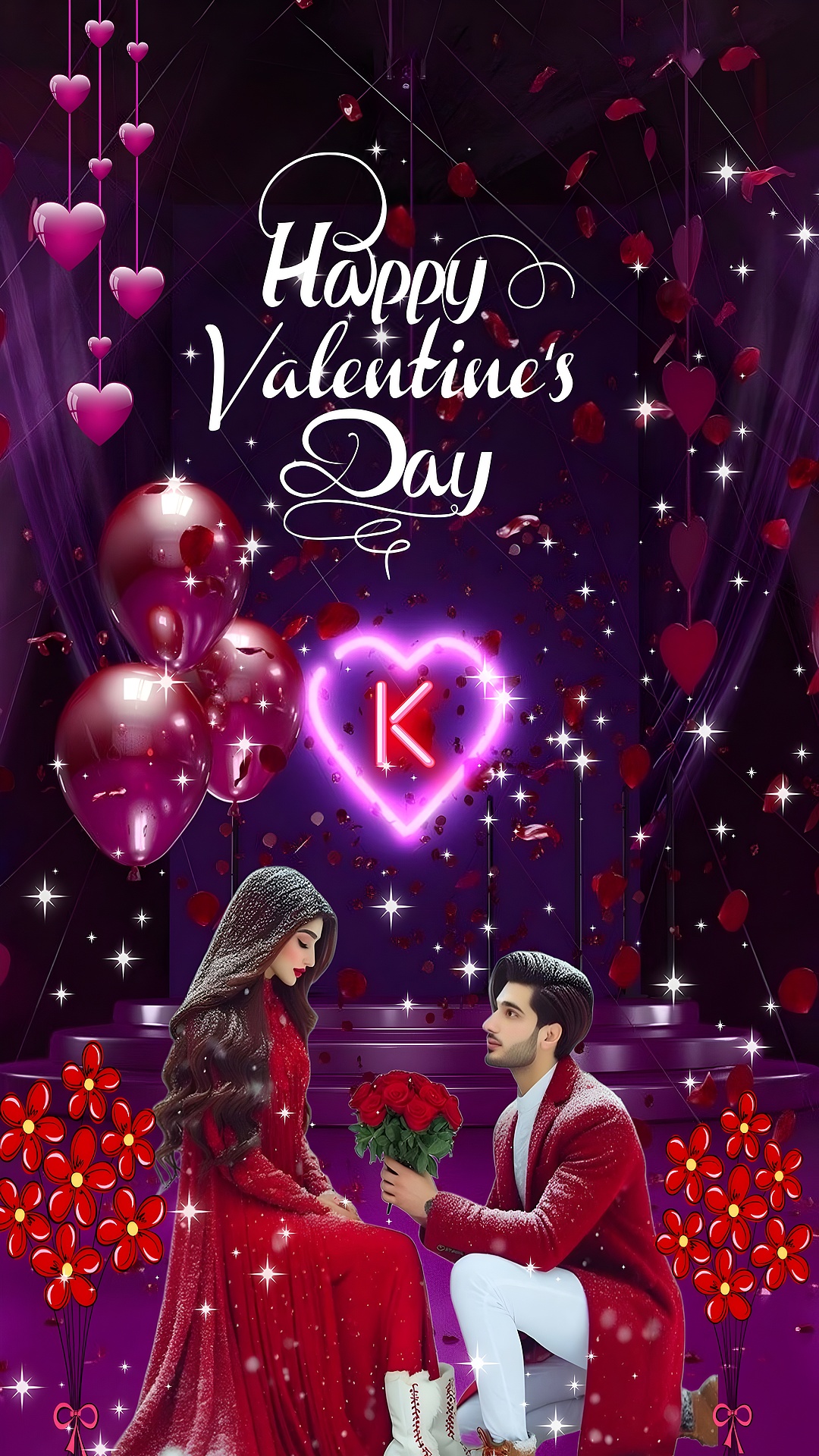 This Romantic Valentine's Day Proposal HD Wallpaper captures a tender and heartfelt moment between a couple immersed in a dreamy, love-filled setting. The image features a man kneeling with a bouquet of red roses, offering them to a woman dressed in a flowing red gown, symbolizing romance and devotion. The backdrop is a rich deep purple, enhanced by glowing neon pink and red heart-shaped balloons and a luminous neon heart with the letter "K" at its center, adding a modern and personalized touch to this intimate scene. The sparkling white light effects scattered throughout the image create a magical atmosphere, evoking feelings of warmth and affection perfect for Valentine's Day celebrations.