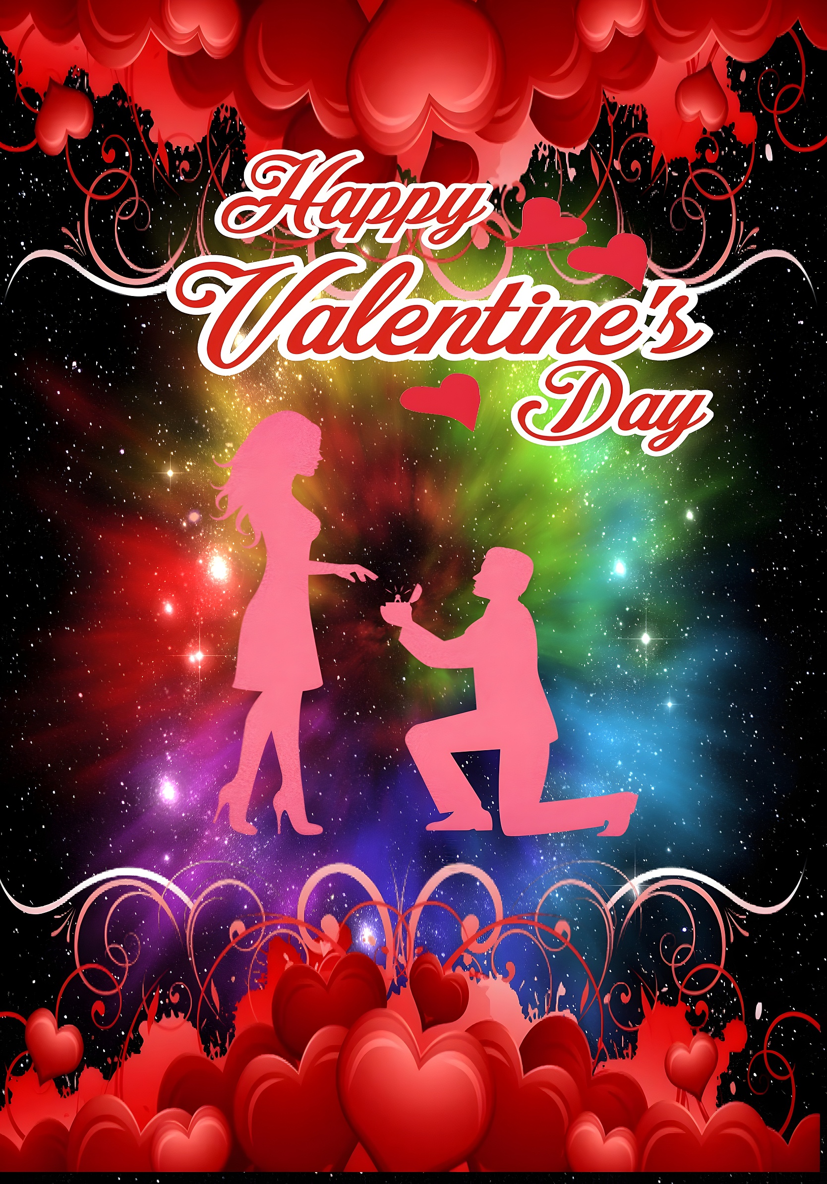 This Romantic Valentine's Day Proposal wallpaper beautifully captures a timeless moment of love and commitment, set against a mesmerizing cosmic backdrop. The central focus is a pink silhouette of a man kneeling with a ring box, proposing to a standing woman, symbolizing romance and heartfelt connection. The scene is framed by an array of vivid red hearts and elegant swirling patterns, enhancing the affectionate theme. The background bursts with a radiant cosmic explosion of colors, including deep blacks, vibrant reds, greens, blues, and purples, creating a dreamy and magical atmosphere perfect for celebrating love.