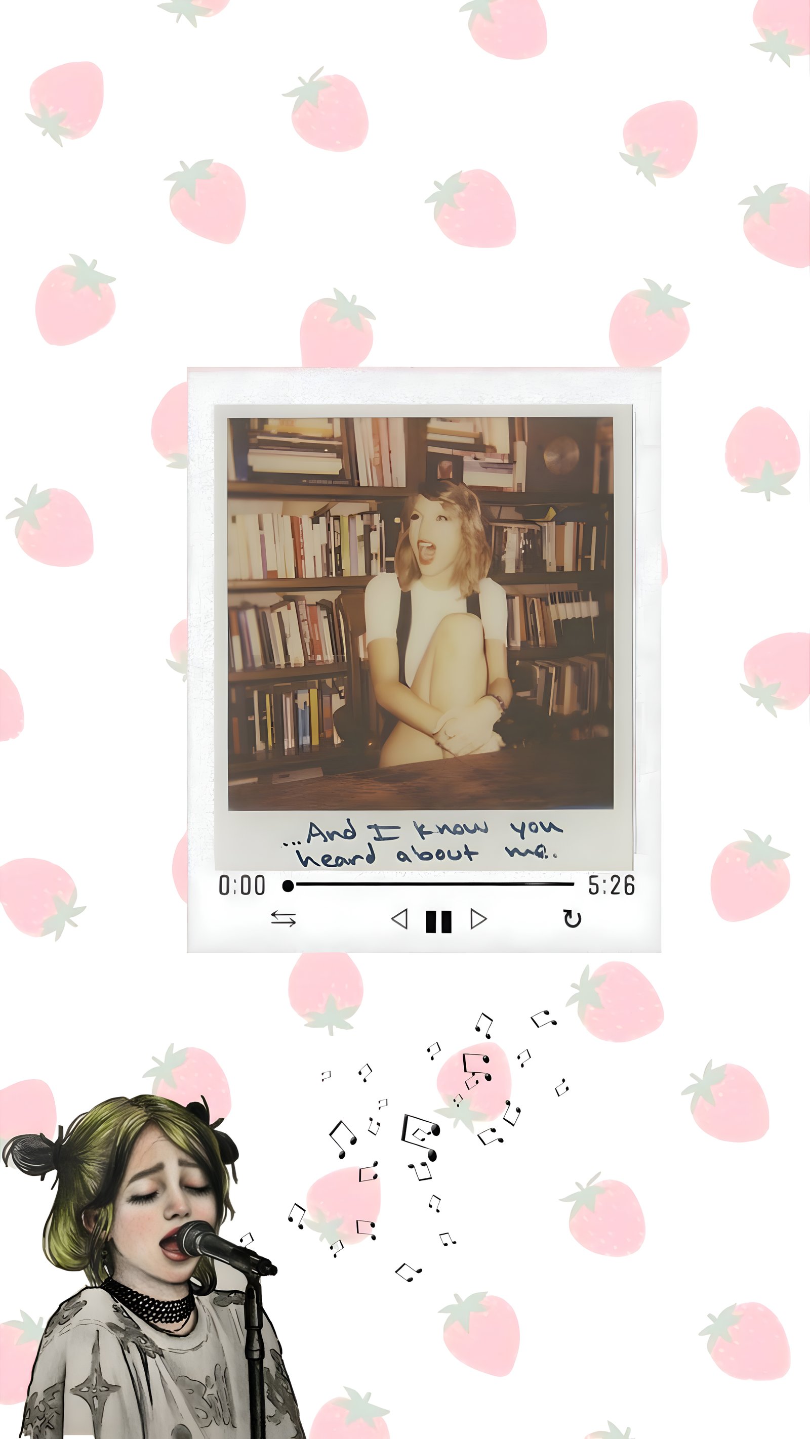 Strawberry music collage this HD wallpaper captures a vibrant and expressive collage that feels both nostalgic and modern. The background features a charming pattern of pink strawberries with green tops, adding a sweet and whimsical touch. At the center, a Polaroid-style photo showcases a smiling woman seated in front of a bookshelf, evoking warmth and candid joy. Beneath the photo, handwritten text reads, “…And I know you heard about me,” hinting at personal storytelling and lyrical depth.