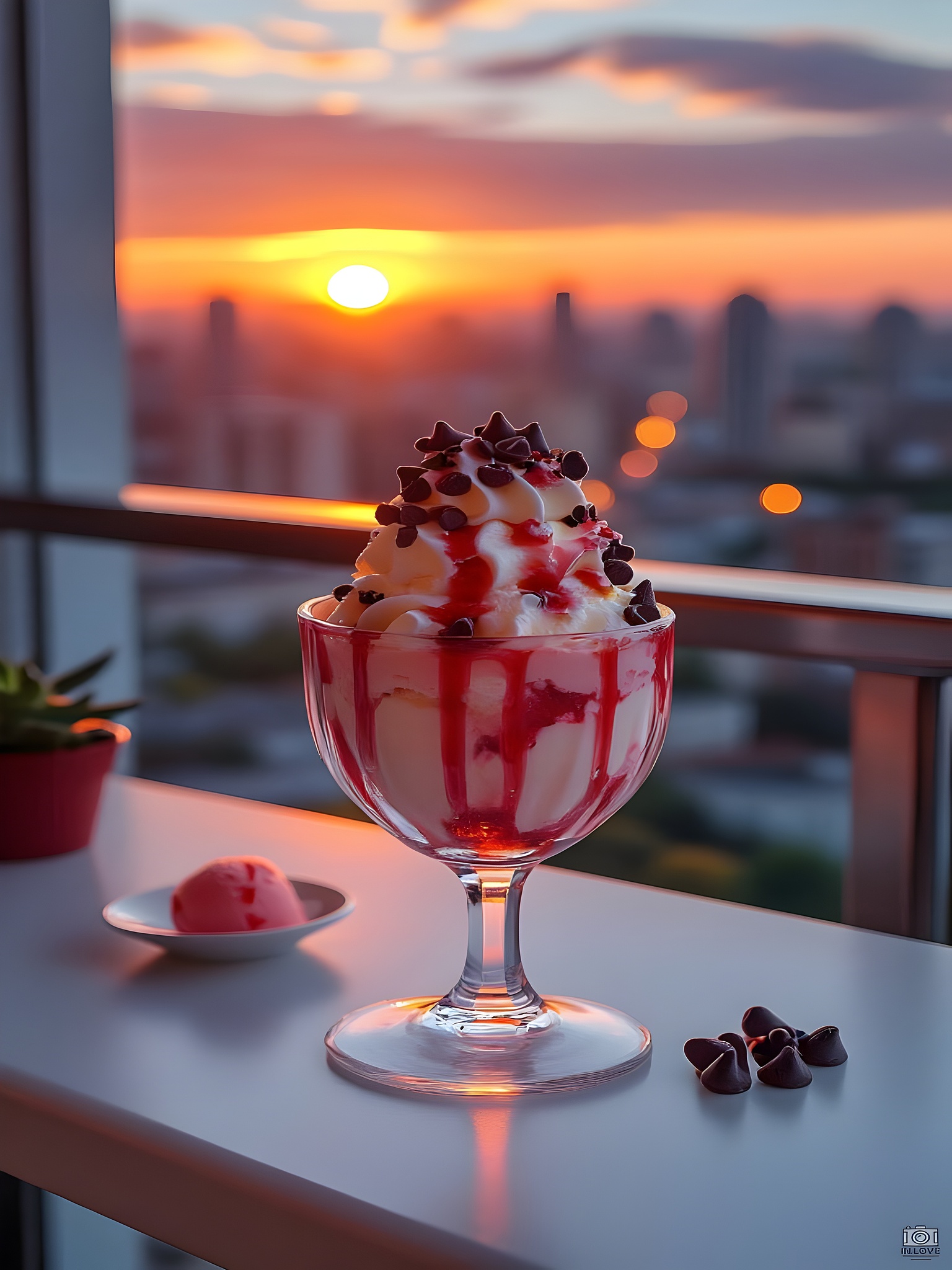 Sunset Dessert City Bliss Over the Cityscape captures a mouthwatering moment of indulgence paired with a breathtaking urban view. A glass cup brimming with vanilla ice cream, drizzled in strawberry syrup and sprinkled with chocolate chips, sits elegantly on a table. The red syrup cascades down the decorative glass, adding a vibrant contrast to the creamy texture. Beside it, a scoop of pink ice cream rests in a white dish, accented with chocolate chips for added charm. A small potted plant adds a touch of nature to the scene.