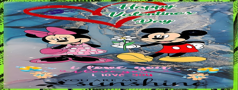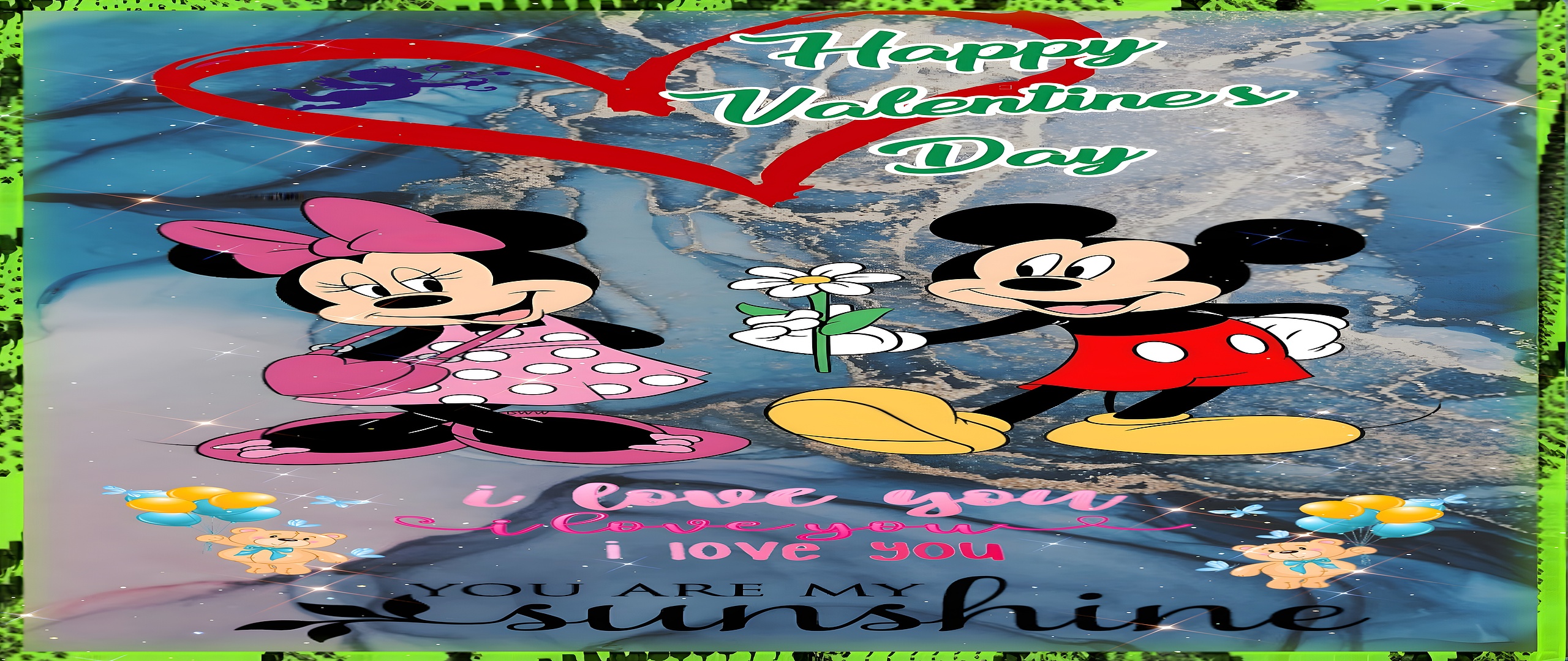 This high-resolution wallpaper blends classic cartoon charm with modern artistic elements like sparkling highlights and a textured marble backdrop, creating a unique desktop background or mobile wallpaper. The green border with a subtle pattern frames the scene, enhancing the lively and affectionate mood. The text "Happy Valentine's Day" in green script and loving phrases such as "i love you" and "YOU ARE MY sunshine" add a heartfelt touch, making this wallpaper ideal for anyone wanting to express love through their screen art.