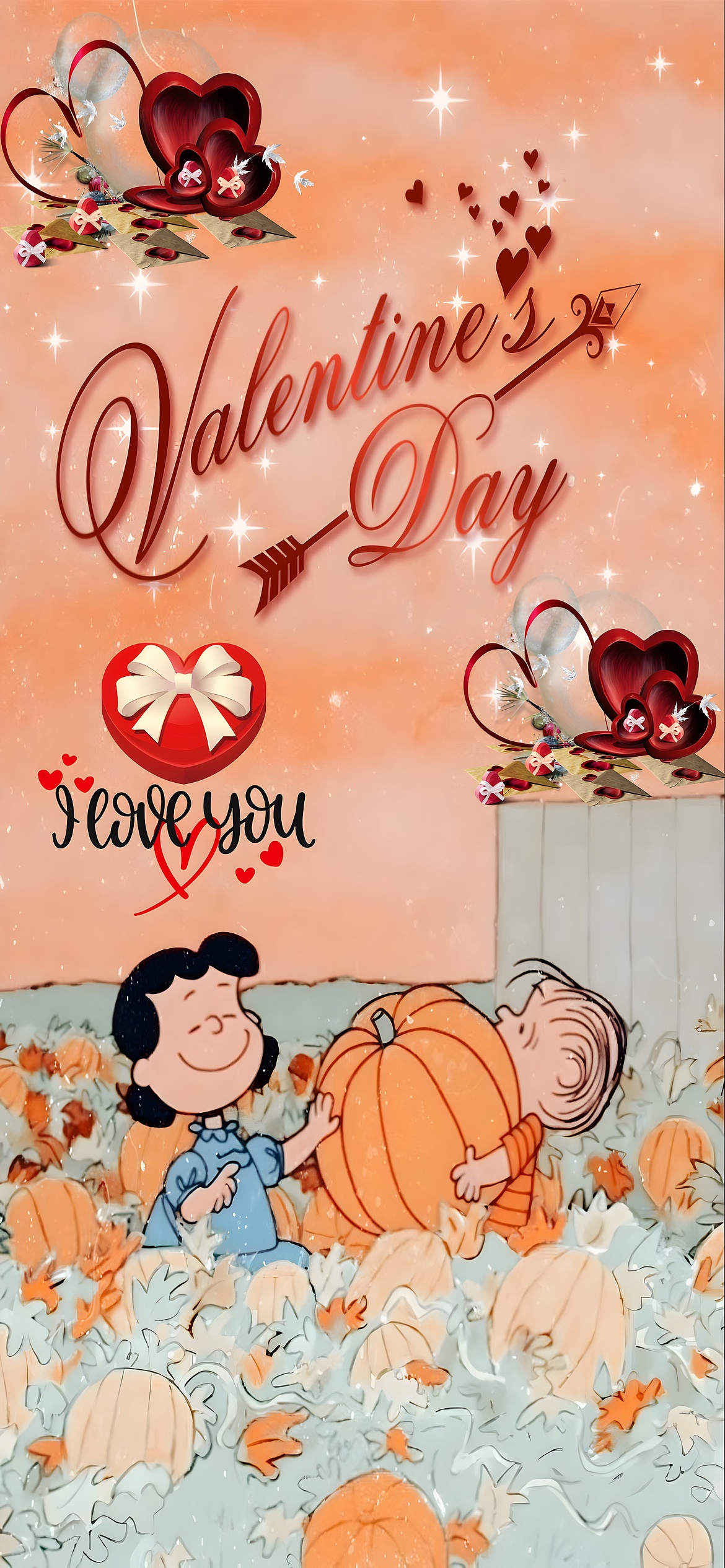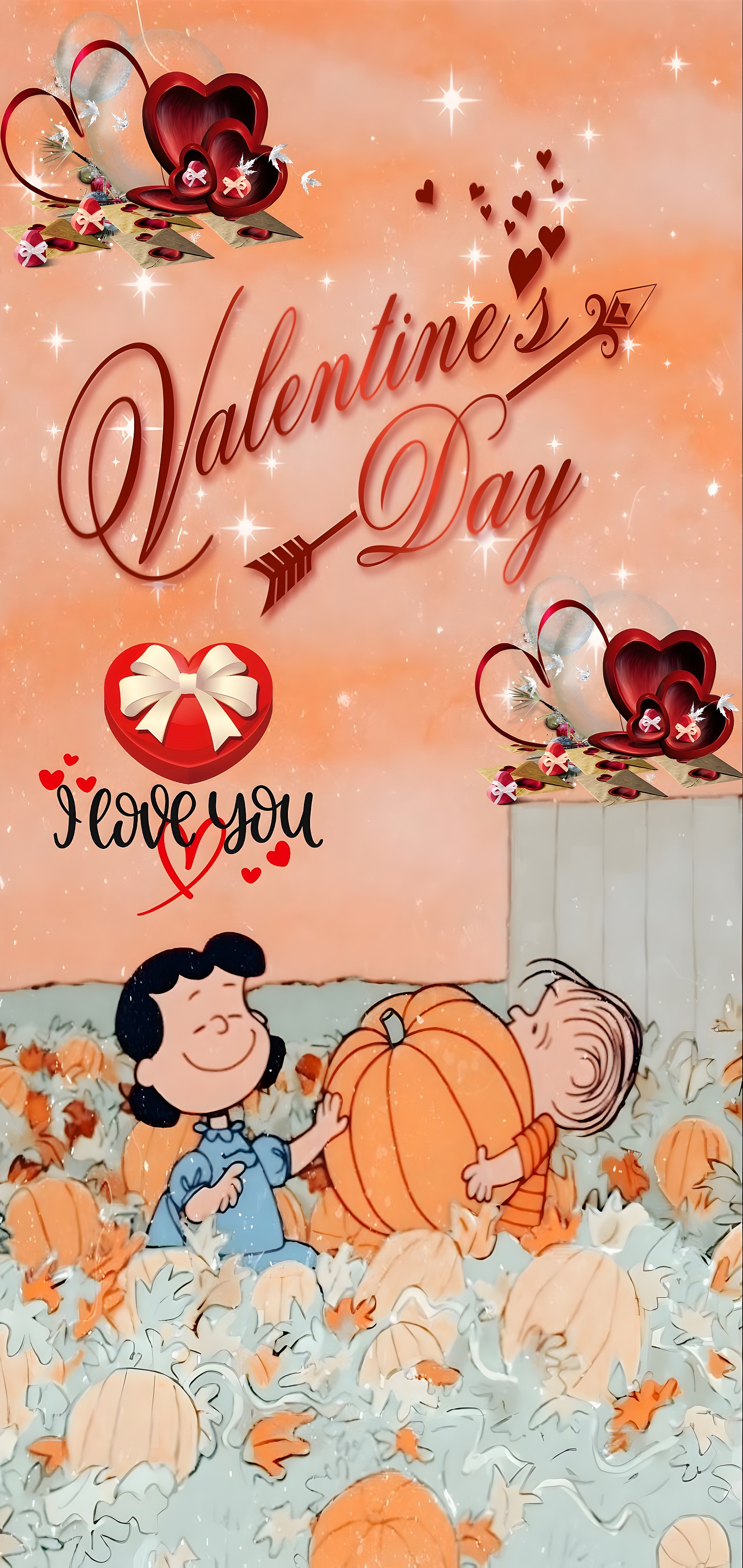 The wallpaper's artistic style combines classic cartoon illustration with modern decorative elements, including shimmering stars and elegant script typography that reads "Valentine's Day" alongside a heart-tipped arrow. The deep red hearts and gift boxes contrast beautifully with the soft orange sky and pastel blue foliage, creating a balanced and inviting color palette. This blend of colors and textures evokes warmth and affection, making it a perfect romantic cartoon scene for Valentine's Day celebrations. Whether used as a seasonal mobile wallpaper or a desktop background, this image brings a sense of joy and love, enhanced by the nostalgic presence of beloved Peanuts characters in a pumpkin-filled autumn setting.