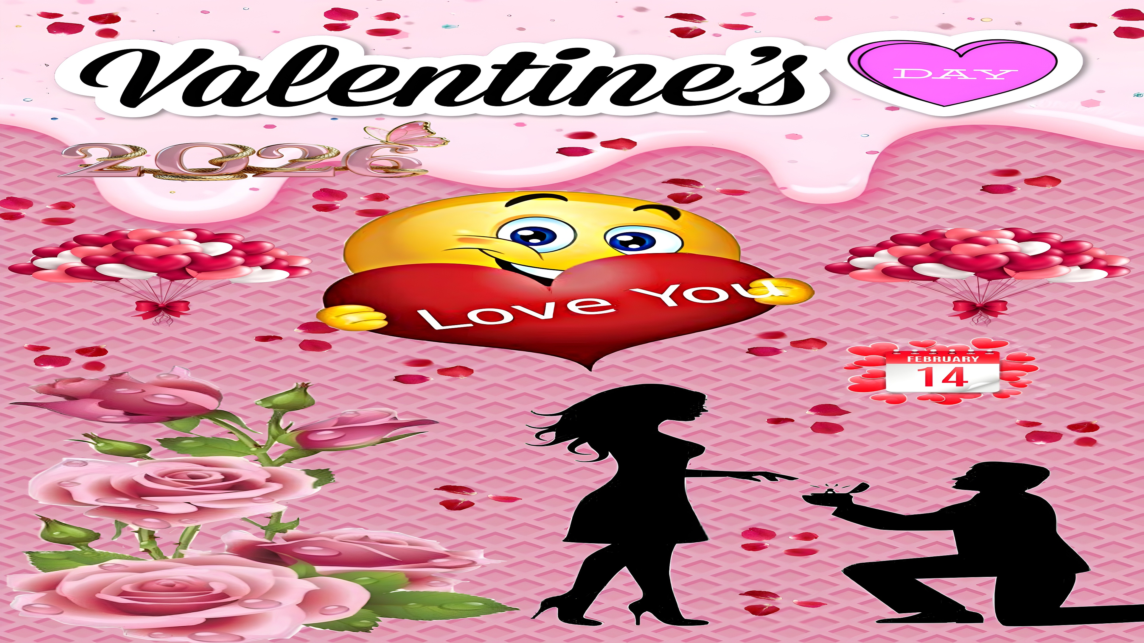 Celebrate love and romance with this vibrant Valentine's Day Romantic Proposal HD wallpaper, perfectly designed for the 2026 season. The wallpaper features a charming scene of a man kneeling with a ring box proposing to a woman, both depicted in elegant black silhouette against a soft pink textured background. This romantic setting is enhanced by delicate rose petals gently falling, creating a dreamy atmosphere that captures the essence of love and commitment. The large smiling emoji holding a bright red heart inscribed with "Love You" adds a playful and affectionate touch, making this wallpaper ideal for expressing heartfelt emotions.
